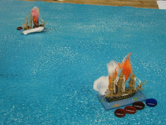 La frégate française Hydra qui escortait l'Hercule meurt bravement sous les coups répétés du HMS Mars et ... de l'Hercule (qui essayait péniblement de toucher ce dernier) ; derrière, les renforts anglais se rapprochent enfin de la passe sud moins délicate dans la gestion du vent contraire et des canons de l'Hercule.